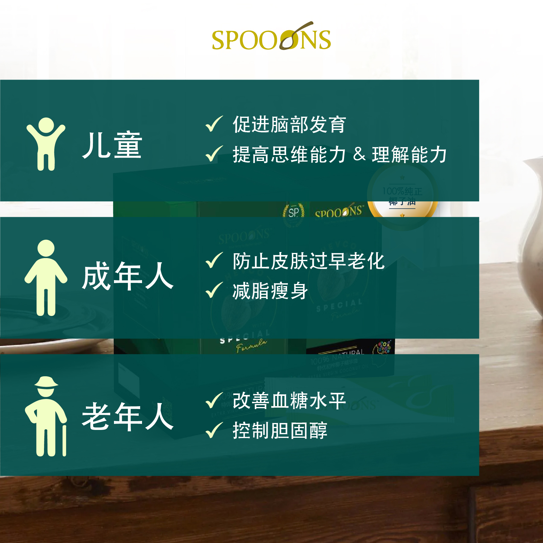 Spoons HEVCO 初榨椰子油是一種 100% 天然油,由新鮮椰子製成,含有高水平的抗氧化劑效力,不使用化學物質、添加劑或防腐劑。 Spoons HEVCO 純天然椰子油,採用來自馬來西亞的最優質椰子的新鮮成熟果仁生產。 🔸 HEVCO 濕磨製程可在初榨椰子油中產生最高等級的多酚。 🔸 HEVCO 含有的酚類物質比 CEVCO 多幾倍。 🔸 HEVCO 製程可產生最高水準的營養特性。 🔸 就像母乳一樣,它富含月桂酸。 🔸 由馬來西亞新鮮採摘的椰子奶製成。 🔸 不含防腐劑、添加劑和化學物質。 Spoons HEVCO 純天然椰子油,採用獨家配方提煉而成,所含有的多酚含量比普通冷壓椰子油高4-7倍! 我們的椰子油不是藥物,而是一種保健品,透過食療的方式,可有效改善自閉症狀,起到排毒、修復及促進腦細胞生長的效果! 它是最純淨的椰子油,具有濃鬱的香氣以及順滑的甜味。 最重要的是,它可以幫助改善您的健康並可能增強大腦功能。 功效 : ✅ 改善自閉症症狀 ✅ 減緩阿茲海默症症狀 ✅ 维持大脑有益化学物质的含量 ✅ 大脑更加清晰,精神状态更好 ✅ 對抗自由基,防止細胞老化 ✅ 預防慢性病 ✅ 增強免疫系統 ✅ 促進減肥 ✅ 改善炎症 ✅降膽固醇 ✅改善糖尿病 ✅改善尿酸 ✅改善口腔問題 ✅ 防止皮膚過早老化 ✅ 專注的眼神交流 ✅ 靈活的肢體語言 ✅ 控制情緒波動 ✅ 敏捷的理解能力 ✅ 提高注意力 ✅ 提高表達能力 ✅ 快速思考的能力 ✅ 流利的語言能力 ✅ 控制口腔敏感度 ✅提高小孩智商 一盒40包 建議份量 : 兒童: 每日1包 成人: 每日2包 如正在服用藥物,請在使用前諮詢醫生。 如出現任何不良反應,請停止使用並諮詢醫生。 常溫保存即可,25°C以下即凝結固態。